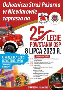 Ochotnicza Straż Pożarna z Niewiarowa świętować będzie 25-lecie powstania. Strażackie święto rozpocznie się Mszą Świętą o godz. 16-tej w intencji strażaków i ich rodzin w Parafii pw. Wniebowzięcia NMP w Niegowici, dalsza część uroczystości odbędzie się obok remizy w Niewiarowie. Tam między innymi zostaną wręczone odznaczenia zasłużonym. Będą też przemówienia okolicznościowe, wpisy do księgi pamiątkowej i poczęstunek. Już od godziny 15-tej na najmłodszych czekać będzie dmuchaniec i małpi gaj. Na godzinę 20-tą OSP zaprasza na zabawę taneczną.