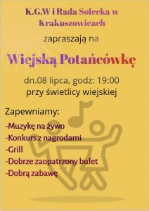 Tanecznie będzie także w Krakuszowicach, za sprawa Wiejskiej Potańcówki. Na przybyłych w tym dniu miłośników tańca czekać będzie muzyka na żywo, konkursy z nagrodami, grill, bufet oraz oczywiście dobra zabawa.