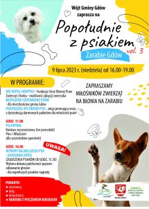 Sympatycy psów wraz ze swoimi pupilami już po raz trzeci są zaproszeni na „Popołudnie z psiakiem” w niedzielę 9 lipca. Tego dnia Zarabie w Gdowie wypełnią radosne czworonogi, spośród których publiczność wybierze tego najsympatyczniejszego. Od godziny 16.00 uczestnicy wydarzenia z terenu gminy Gdów będą mogli bezpłatnie zaczipować swoje zwierzęta. Chętni będą też mogli zaadoptować zwierzaka z Schroniska w Borku- Fundacja Straż Obrony Praw Zwierząt . W celu promocji sprzątanie po swoim psie, rozdawane będą bezpłatne pakiety, ułatwiające tą czynność. Będą też konkursy zręcznościowe i tory przeszkód dla piesków i ich właścicieli, stoiska wystawców, lody i dmuchańce, a popołudnie z psiakiem zakończy wspólne ognisko z pieczeniem kiełbasek. Na wydarzenie organizowane przez Gminę Gdów (Referat Rolnictwa, Leśnictwa i Ochrony Środowiska) oraz Zarabie Gdów – Strefa Rekreacji zaprasza Wójt Gminy Gdów Zbigniew Wojas.