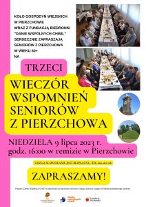 Po raz trzeci seniorów z Pierzchowa na Wieczór Wspomnień zaprasza w niedzielę o godz. 16-tej Koło Gospodyń Wiejskich w Pierzchowie. Wieczór pełen wspomnień, smaków i muzyki jest organizowany przez KGW w ramach I edycji programu Danie Wspólnych Chwil z Fundacją Biedronkii i cieszy się dużym zainteresowaniem pierzchowskich seniorów w wieku 60+.