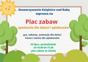W poniedziałek Stowarzyszenie Książnice nad Rabą zaprasza na… plac zabaw obok książnickiej szkoły. Tu czekać będą gry, zabawy i animacje dla dzieci. W tym czasie ich opiekunowie będą mieć chwilę wolnego czasu na rozmowy przy kawie i słodkim poczęstunku.