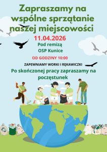 Równolegle, tego samego dnia w Kunicach odbędzie się lokalna akcja sprzątania miejscowości. Zbiórkę zaplanowano o godzinie 10:00 przy remizie OSP Kunice. Organizatorzy zapewniają uczestnikom worki na odpady oraz rękawiczki ochronne, a po zakończeniu prac zapraszają na wspólny poczęstunek.